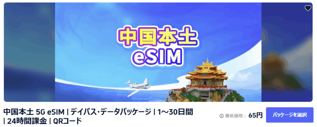 中国本土 5G eSIM | デイパス・データパッケージ | 1~30日間 | 24時間課金 | QRコード | Trip.com